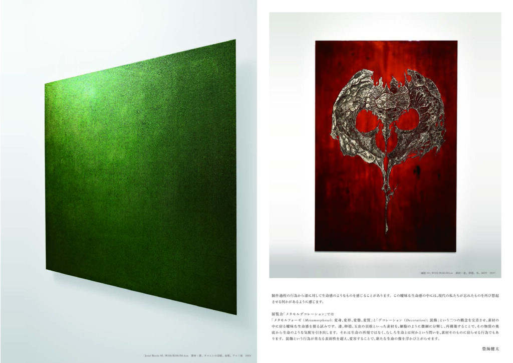 豊海 健太さんは、卵殻や玉虫のはねなど自然素材を巧みに用いた加飾技法によって、独自の世界観をもつ漆の平面作品を制作し、近年注目を集める気鋭の作家です。繊細さと大胆さが共存する作品群は、漆芸という伝統技術に新たな光を当てています。